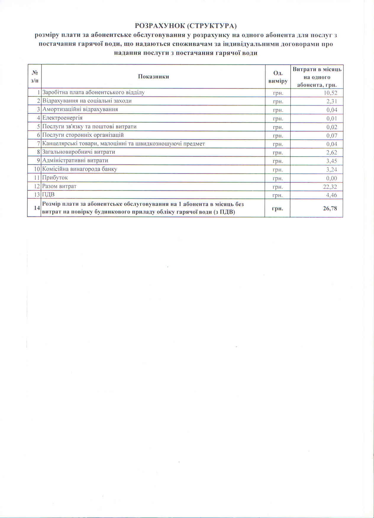 - на послугу з постачання гарячої води споживачам, будівлі яких не обладнані вузлами комерційного обліку – 26,78 грн згідно структури