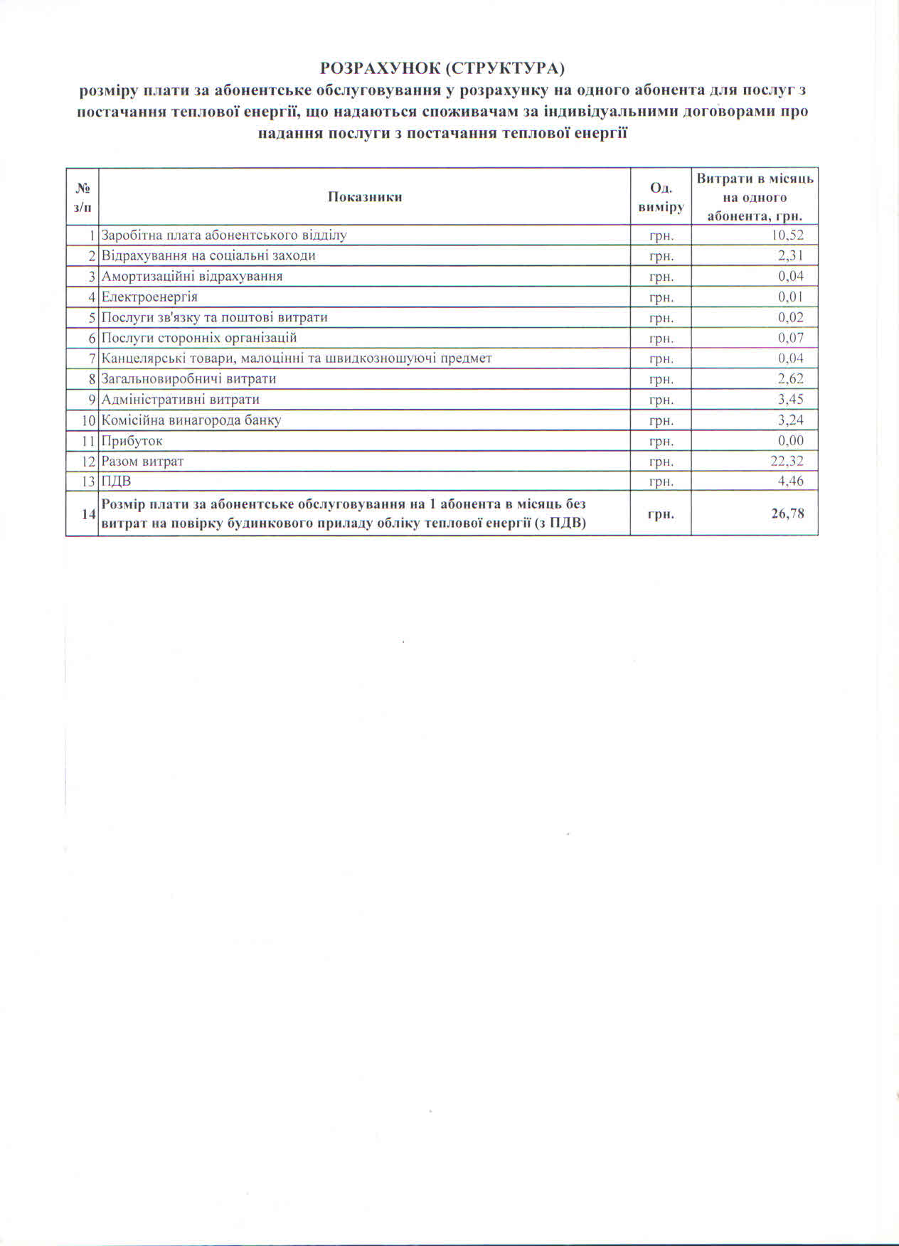 - на послугу з постачання теплової енергії споживачам, будівлі яких не обладнані вузлами комерційного обліку – 26,78 грн згідно структури