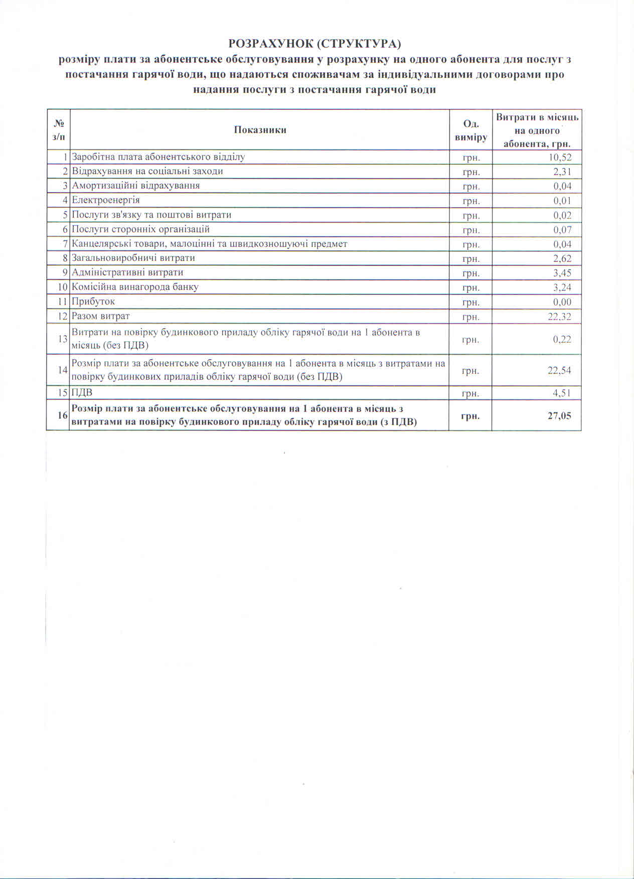 - на послугу з постачання гарячої води споживачам, будівлі яких обладнані вузлами комерційного обліку – 27,05 грн згідно структури