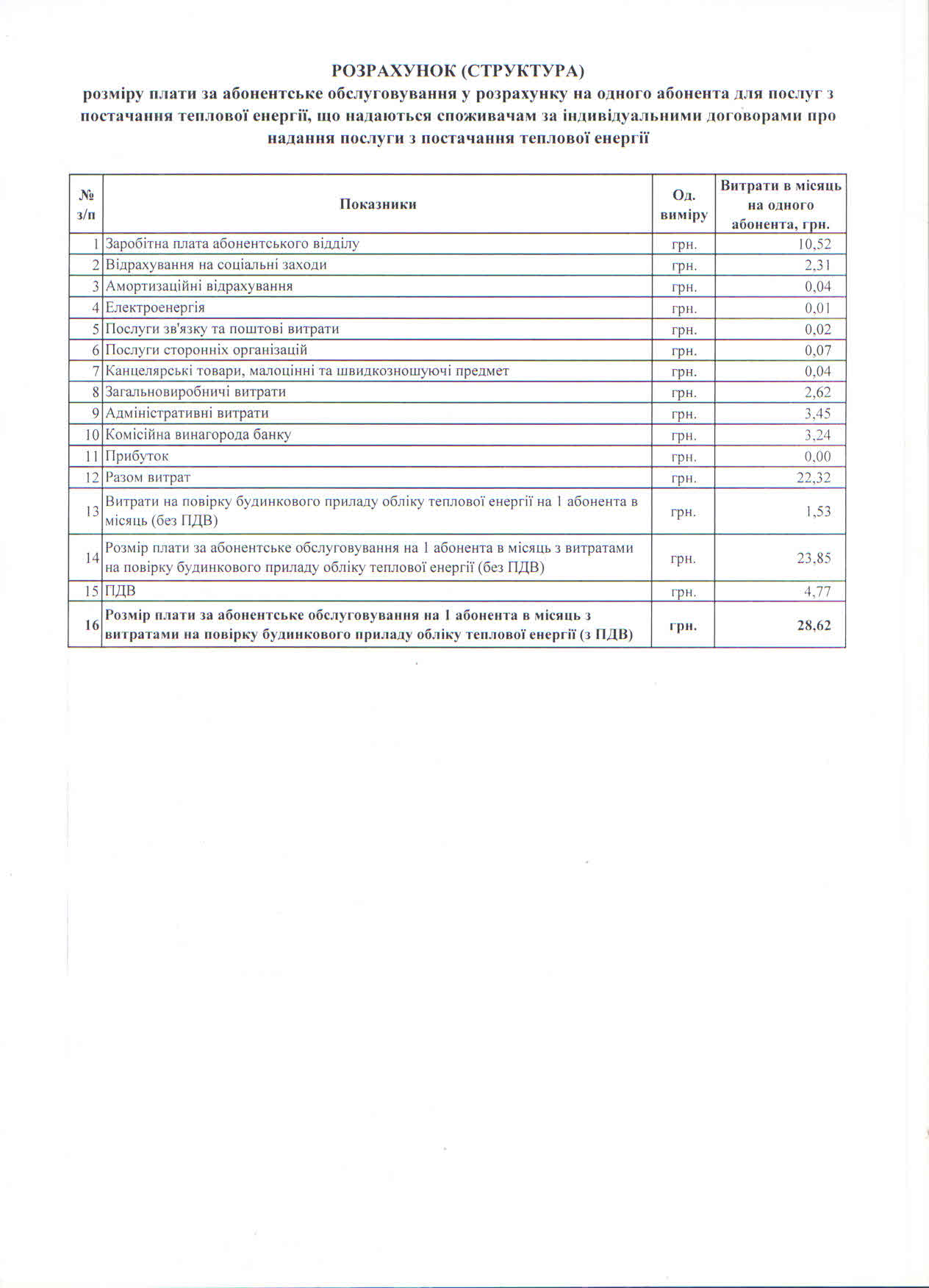 - на послугу з постачання теплової енергії споживачам, будівлі яких обладнані вузлами комерційного обліку – 28,62 грн згідно структури